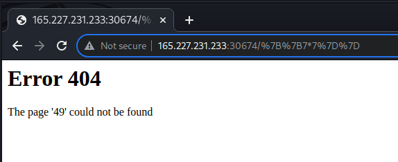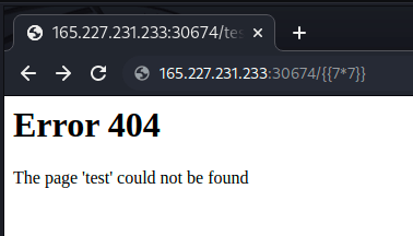 Interestingly the path is displayed in the error message – maybe this is something we can attack! We can try the standard {{7*7}} check to see if we can run expressions in the URL: