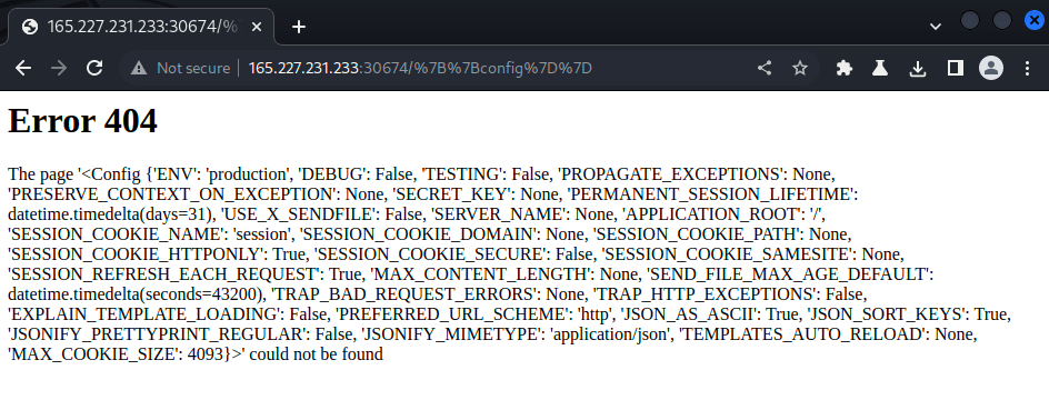With ’49’ appearing instead of ‘7*7’ we have proven that we can run expressions by placing them in the URL. Flask holds a lot of configuration info in the config variable, so lets put that in and see what happens:
