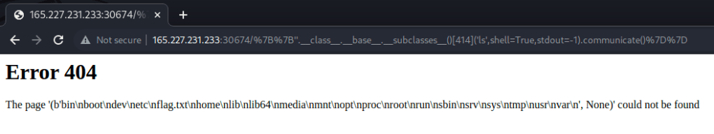 There are some interesting classes in here, so slice around until you find one that you like – in my case subprocess.Popen was available at the 414th index. Since we can run system commands with Popen we should be able to execute code. To test this out, run the following in the url: