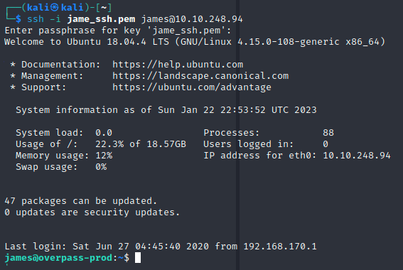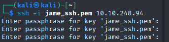We can place the string above into something like “james_ssh.pem” and CHMOD it to 700 and attempt to login. Unfortunately this isn’t as trivial as it seems – a passcode has been set for the key (I made a typo in the key name don’t kill me):