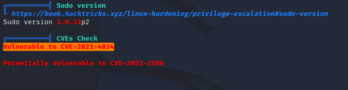 Before getting too deep (capabilities also failed to find anything) I’m going to run an automated check, linPEAS, for other priv esc opportunities. Immediately we have a solid result: